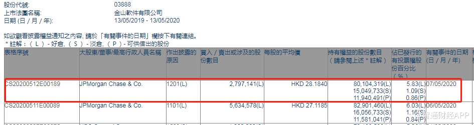 智通财经APP获悉,联交所最新资料显示,5月7日,摩根大通减持金山软件(03888)279.71万股,每股作价28.184港元,总金额约为7883.35万港元。减持后最新持股数目约为8010.43万股,最新持股比例为5.83%。