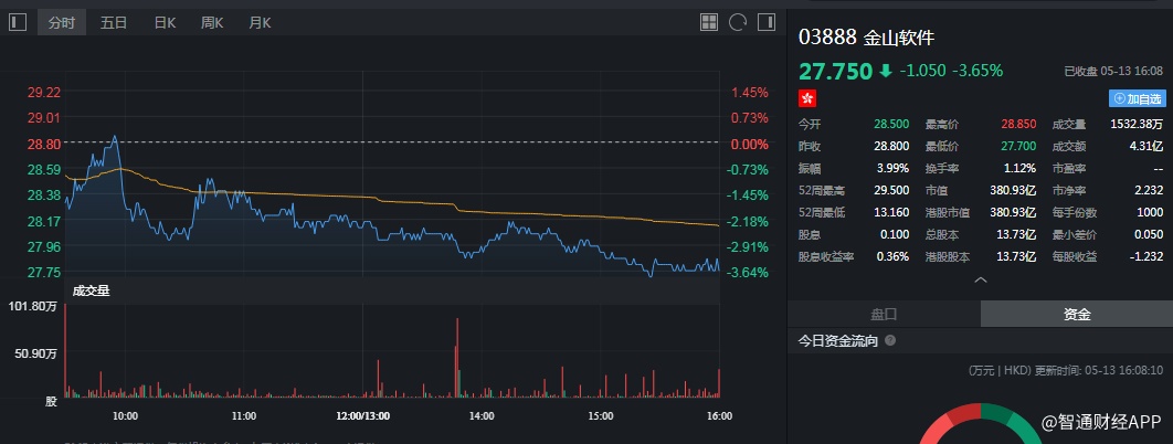 截至今日收盘,金山软件跌3.65%,报27.75港元。