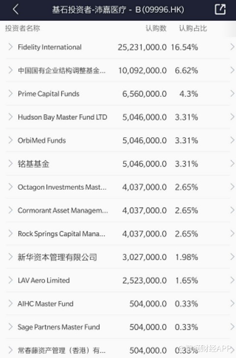 沛嘉医疗上市前引入14个基石投资者,合共认购约1.51亿美元股份,投资人大牌云集,由原股东国调基金以及礼来亚洲参与,并引入了世界顶级长线基金富达国际基金(Fidelity International)和专业医疗投资基金涌金资产管理、奥博资本领衔,其他还有铭基基金(Matthews Asia)、Hudson Bay、Cormorant Asset Management、Rock Springs Capital等国际大牌基金共同参与,加上新华保险旗下的资产管理平台新华资管的支持,如此多投资人鼎力相助,阵容之强,可以说是近年之最。