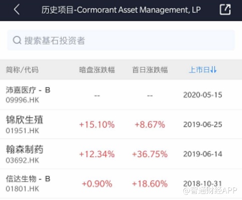 以Cormorant Asset Management为例,2018年到2020年至今,这家机构共参与了3家医疗健康领域公司的基石投资,这些新股公司挂牌首日涨跌幅超过20%。