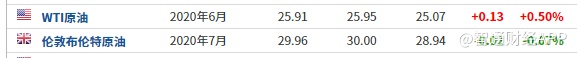 截至发稿,WTI原油涨0.50%,报25.91美元/桶。布伦特原油跌0.07%,报29.96美元/桶。