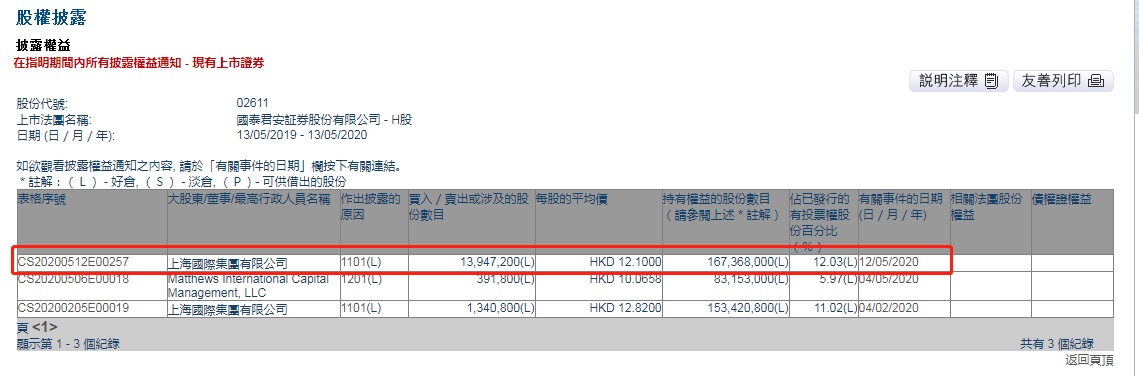 智通财经APP获悉,联交所最新资料显示,5月12日,上海国际集团增持国泰君安(02611)约1395万股,每股作价12.1港元,总金额约1.69亿港元。增持后最新持股数目约为1.67亿股,最新持股比例为12.03%。