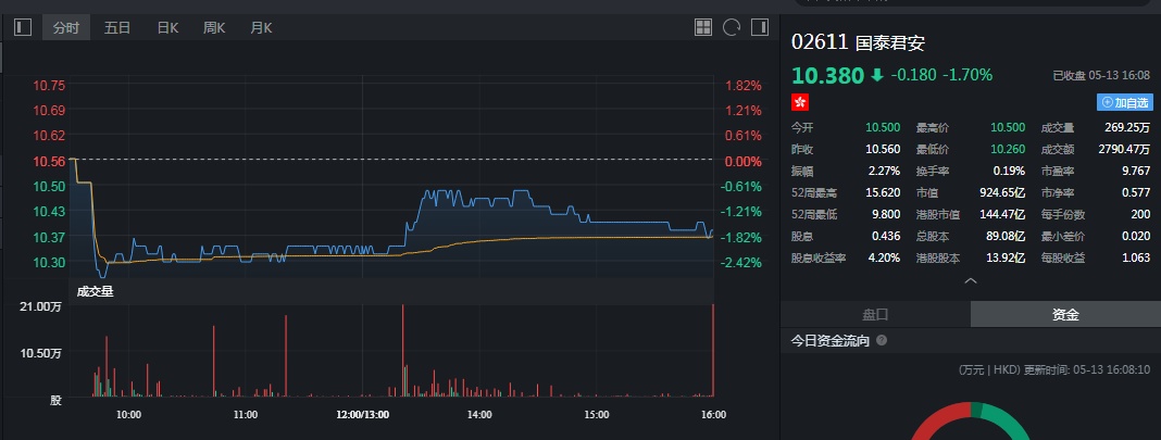 截至今日收盘,国泰君安跌1.70%,报10.38港元。
