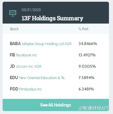 景林资产前十名持股集中度为91.99%,主要集中在消费零售和教育行业,其中前五大重仓股分别为阿里巴巴(BABA.US)、Facebook(FB.US)、京东(JD.US)、新东方(EDU.US)以及拼多多(PDD.US)。
