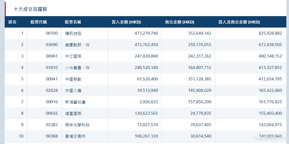 其中,沪港通上榜十大成交活跃榜的有腾讯控股(00700)、美团点评-W(03690)、中芯国际(00981)、小米集团-W(01810)、中国移动(00941)、中国人寿(02628)、新鸿基地产(00016)、复星国际(00656)、舜宇光学科技(02382)和香港交易所(00388)。