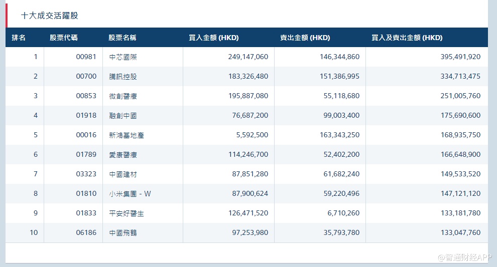 至于,深港通上榜十大成交活跃榜的有中芯国际(00981)、腾讯控股(00700)、微创医疗(00853)、融创中国(01918)、新鸿基地产(00016)、爱康医疗(01789)、中国建材(03323)、小米集团-W(01810)、平安好医生(01833)、中国飞鹤(06186)。