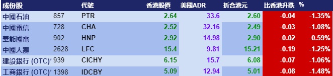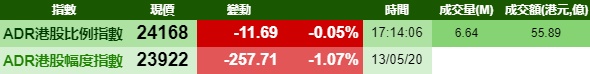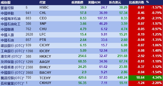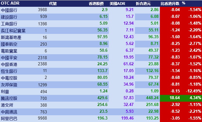 智通财经APP获悉,美股大幅受挫,但受益于腾讯控股强势,港股ADR指数仅小幅下跌,按比例计算,收报24168点,跌11.69点或0.05%。