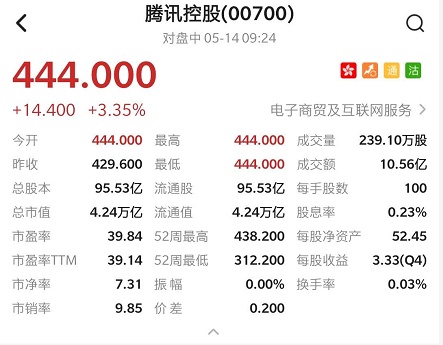 智通财经APP获悉,腾讯控股(00700)发布一季度业绩,期内收入1080.65亿元,同比增长26%。第一季度净利润288.96亿元,同比增长6%。经调整净利润同比增长29%至人民币270亿元。业绩超出市场预期,腾讯今日高开3.35%,报444港元,成交额10.56亿港元。