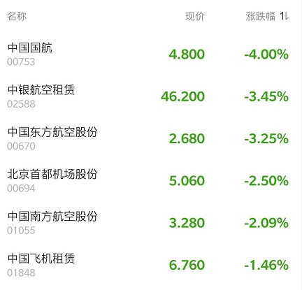 截至发稿,中国国航(00753)跌3.8%,报4.81港元;东方航空(00670)跌3.25%,报2.68港元;首都机场(00694)跌2.7%,报5.05港元;南方航空(01055)跌2.09%,报3.28港元。