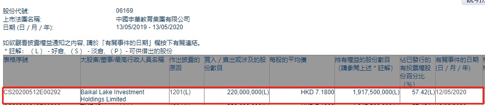 智通财经APP获悉,联交所最新资料显示,5月12日,Baikal Lake Investment Holdings Limited减持宇华教育(06169)2.2亿股,每股作价7.18港元,总金额约为15.796亿港元,减持后最新持股数目为19.175亿股,最新持股比例为57.42%。