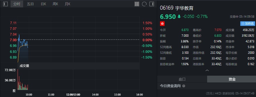 截至发稿,宇华教育跌0.71%,报6.95港元。