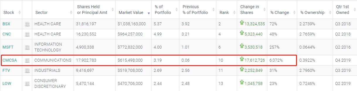 值得注意的是,维京大举增持康卡斯特(CMCSA.US),总持股数升至约1790万股,价值约6亿美元,为本季度最大增持标的,同时持仓占比从0.06%上升至3.19%,位列所有持仓标的第十位。