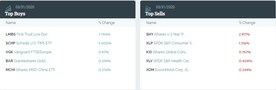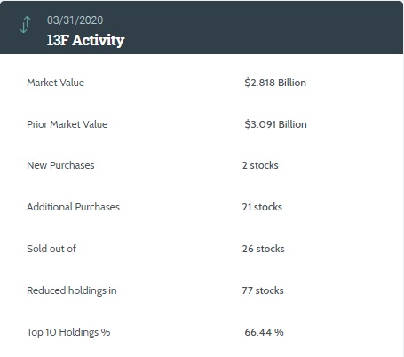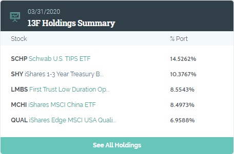 前五大减持股分别为美国国债1-3年ETF-ishares、消费品指数ETF-SPDR主要消费品(XLP.US)、iShares安硕全球必需消费品ETF (KXI.US)、健康照护类股ETF-SPDR(XLV.US)以及埃克森美孚 (XOM.US)。减持比例分别为2.917%、1.316%、0.767%、0.408%和0.249%。