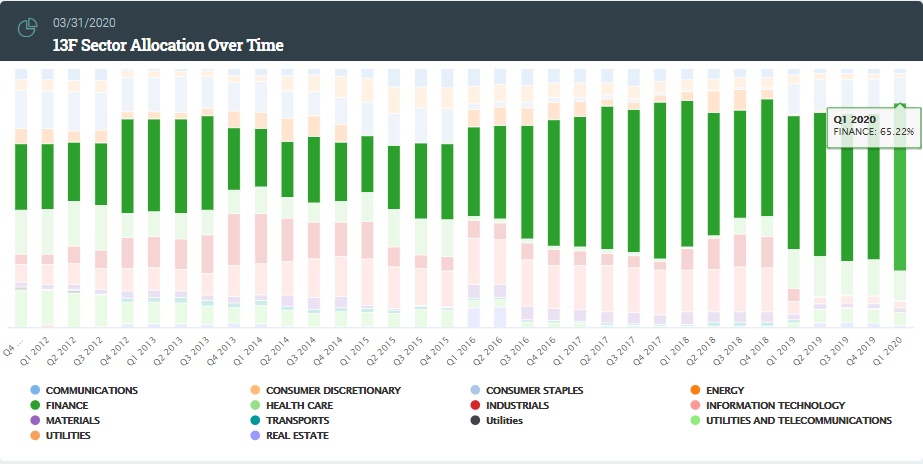 另外,Richard Bernstein Advisors所持仓类型中金融行业(65.22%)占据绝对主导地位,并呈现平稳趋势。