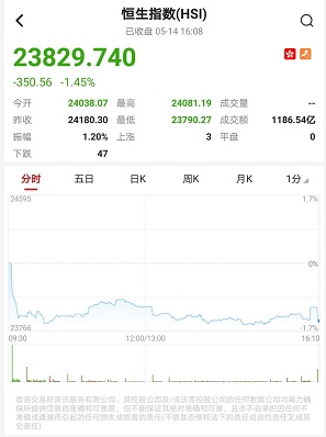 智通财经APP获悉,恒指早盘低开142.23点或0.59%,报24038.07点。截至收盘,恒生指数跌350.56点或1.45%,报23829.74点,全日成交额达1186.54亿。国企指数跌1.51%,报9687.1点,红筹指数跌1.37%,报3733.87点。