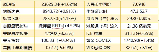 1、周四(5月14日)美股低开高走,道指早盘曾跌达458点,随后震荡走高,三大指数收市均扭转盘初跌势。截至收盘,道指涨1.62%,报23625点;标普500涨1.15%,报2852.5点;纳指涨0.91%,报8943.72点。隔夜美股先跌后回升,港股ADR指数小幅上涨,按比例计算,收报23861点,升31.8点或0.13%。