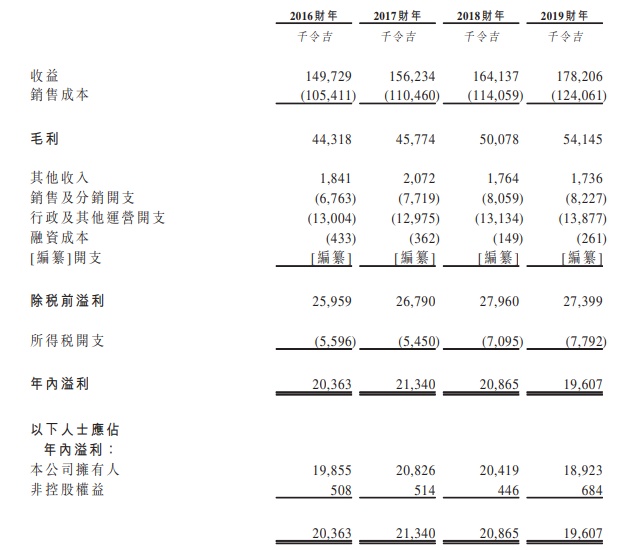 近四年,总收益分别约为1.50亿令吉、1.56亿令吉、1.64亿令吉及1.78亿令吉,于过去四个年度的复合年增长率约为6.0%,而公司拥有人应占期间纯利分别约为1985.5万令吉、2082.6万令吉、2041.9万令吉及1892.3万令吉。