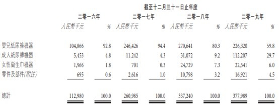 于往绩记录期间,公司的产品主要包括婴儿纸尿裤机器、成人纸尿裤机器、女性卫生巾机器及零件和部件。其中销售婴儿纸尿裤机器是公司的主要收入来源,截至2019年12月31日止四个年度,该收入分别占总收入的92.8%、94.4%、80.3%及59.8%。