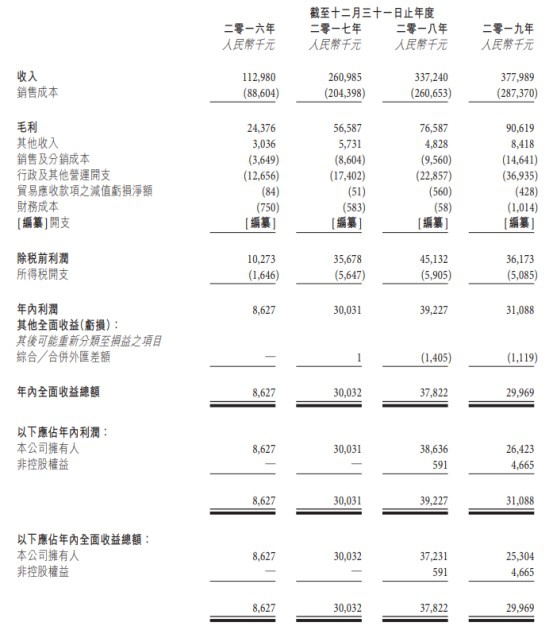 公司的收入呈升势,由截至2016年12月31日止年度约人民币1.13亿元增加约人民币1.48亿元或约131.0%至截至2017年12月31日止年度约人民币2.61亿元,并进一步增加约人民币7620万元或约29.2%至截至2018年12月31日止年度约人民币3.37亿元。收入增加主要由于婴儿纸尿裤机器销量增加。