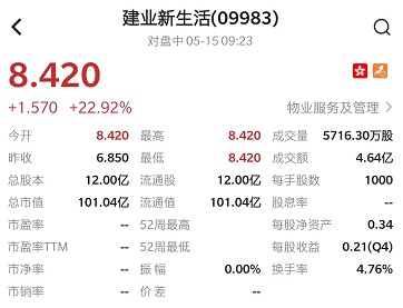 智通财经APP获悉,建业新生活(09983)首日挂牌,公告显示,公司发行3亿股,每股定价6.85港元,每手1000股,所得款项净额估计约为19.16亿港元。截至发稿,涨22.92%,报8.42港元,成交额4.64亿港元。