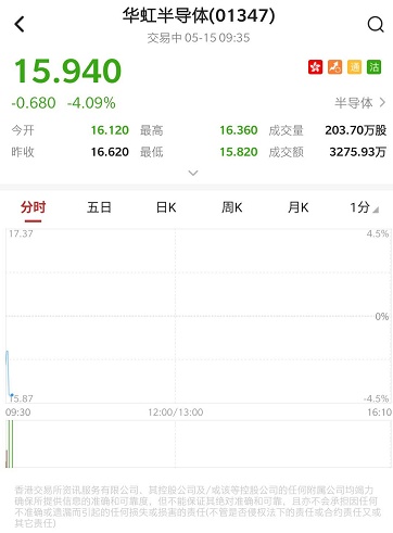 跌4.33%,报15.9港元,成交额3696.26万港元。