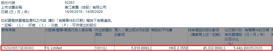 智通财经APP获悉,联交所最新资料显示,5月8日,FIL Limited增持东江集团控股(02283)581万股,每股作价2.355港元,总金额约为1368.26万港元,增持后最新持股数目约为4533.2万股,最新持股比例为5.44%。