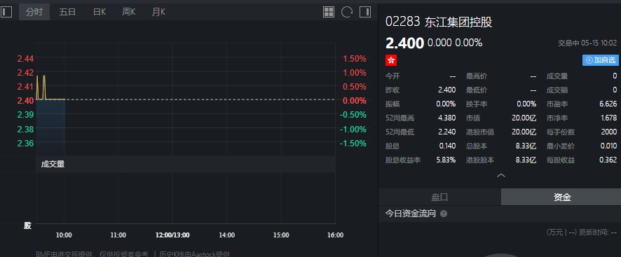 截至发稿,东江集团控股无涨跌,报2.4港元。