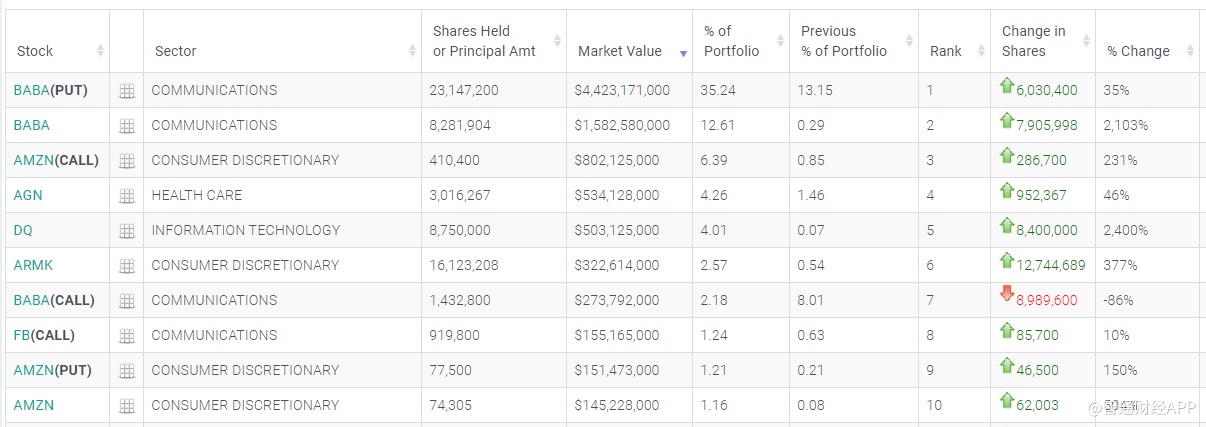 值得注意的是,野村控股本季度大举卖出阿里巴巴看涨期权(-86%),但其持仓总值占比仍有2.18%,位列第七。