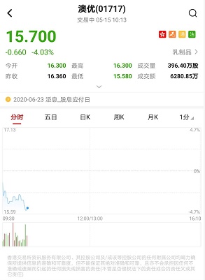 智通财经APP获悉,乳制品板块集体承压,澳优(01717)早盘股价走弱,截至10时13分,跌4.03%,报价15.7港元,成交额6280.85万。
