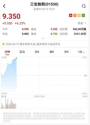 智通财经APP获悉,三生制药(01530)早盘急升逾6%,突破多条均线,创逾一个月新高,截至10时31分,涨6.25%,报价9.35港元,成交额5121.55万。