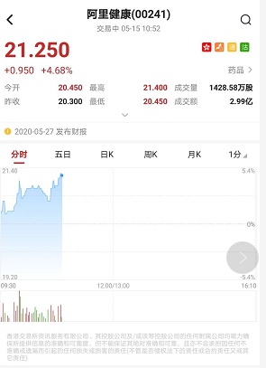 智通财经APP获悉,阿里健康(00241)盘中涨幅一度扩大逾5%,高见21.4港元逼近历史新高,截至10时52分,涨4.68%,报价21.25港元,成交额2.99亿。