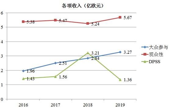 2019年,万达体育营收约10.3亿欧元,同比下降9%。其中大众性体育收入3.27亿欧元,同比增长15%,观众性体育收入5.67亿欧元,同比增长8%,而DPSS收入1.36亿欧元,同比大幅下滑58%。