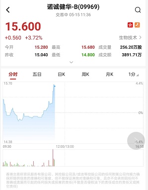 智通财经APP获悉,生物医药器械类股获市场追捧,诺诚健华-B(09969)盘中直线拉涨逾4%,以15.68港元再度刷新上市新高,截至11时34分,涨4.26%,报价15.68港元,成交额3773.09万。