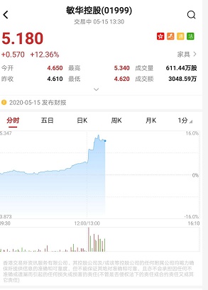 智通财经APP获悉,敏华控股(01999)午间发布年度业绩,股东应占溢利增20.1%至16.38亿港元,末期息每股12港仙。午后股价直线拉涨,截至13时30分,涨12.36%,报价5.18港元,成交额3048.59万。