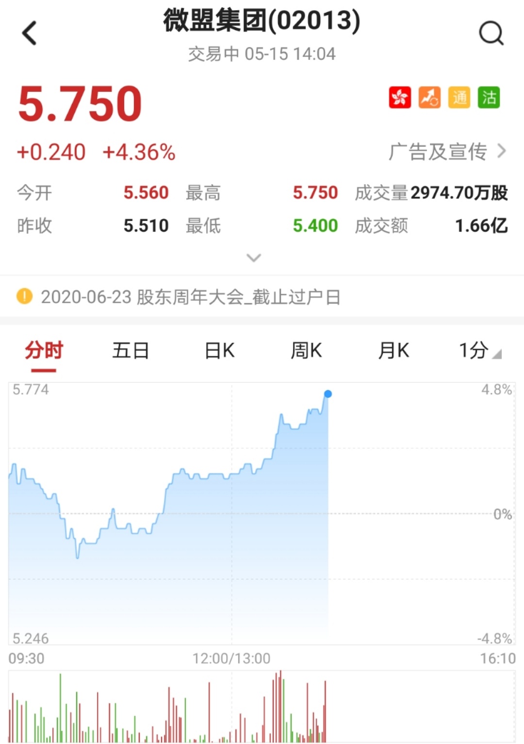 智通财经APP获悉,该股盘中涨近4%,突破多条均线。截至14时04分,涨4.36%,报价5.75港元,成交额1.66亿。