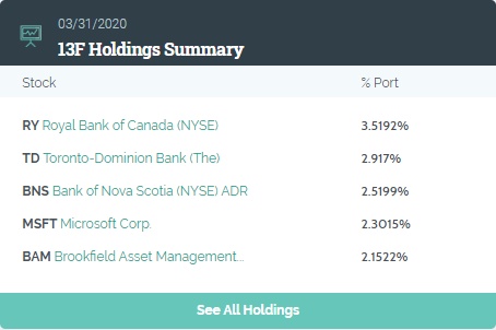 除加拿大皇家银行之外,位列第二至第五的重仓股分别为多伦多道明银行(TD.US),占比2.917%,持股数为21509408股;第三名丰业银行(ABBV.US),占比2.5199%,持股数为19401598股;第四名微软(MSFT.US),占比2.3015%,持股数为4538416股以及第五名布鲁克菲尔德资产管理(BAM.US),占比2.1522%,持股数为16302310.5股;其中布鲁克菲尔德资产管理的持仓数环比上涨26%。