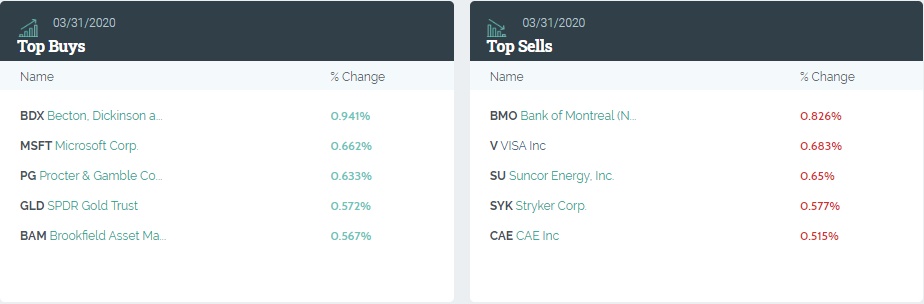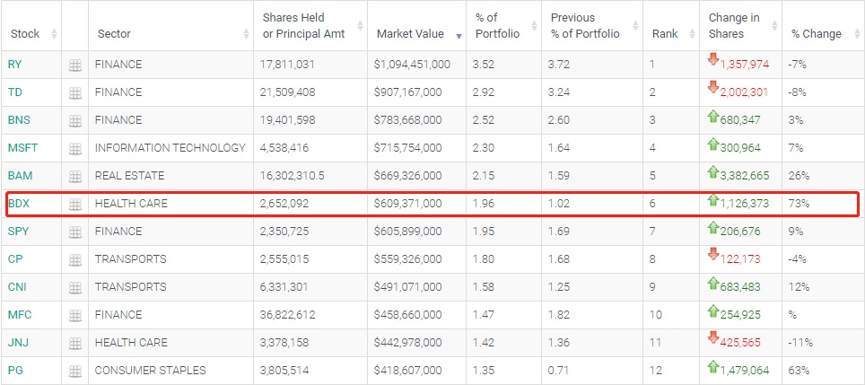 卖出的前五大股分别为蒙特利尔银行(BMO.US)、VISA(V.US)、森科能源 (SU.US)、史赛克(SYK.US)以及CAE (CAE.US)。