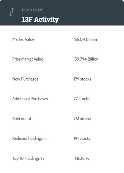 数据显示,桥水持仓总市值达50.4亿美元,上一季度(2019年Q4)为97.94亿美元,环比大幅下降约49%,几近腰斩。本季度,桥水新增标的179只,清仓标的251只;增持了27只股票,减持了191只股票。