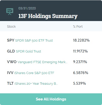 除标普500指数ETF-SPDR之外,位列第二至第五的重仓股分别为黄金ETF-SPDR(GLD.US),占比11.9172%,持股数为4056627股;第三名新兴市场ETF-Vanguard MSCI(VWO.US),占比9.2371%,持股数为13875259股;第四名标普500指数ETF-ishares (IVV.US),占比6.5876%,持股数为1284789股以及第五名ishares安硕20年期以上美国国债(TLT.US),占比5.539%,持股数为1692081股;前五大重仓股中,唯一没有遭到减持的是黄金ETF-SPDR以及第八位的黄金信托ETF-ISHARES (IAU.US); 事实上这也证明了桥水所采取风险评价策略以及中长期持有黄金资产策略的正确性,黄金自三月下旬金价触及低位之后便开始强势反弹至今。