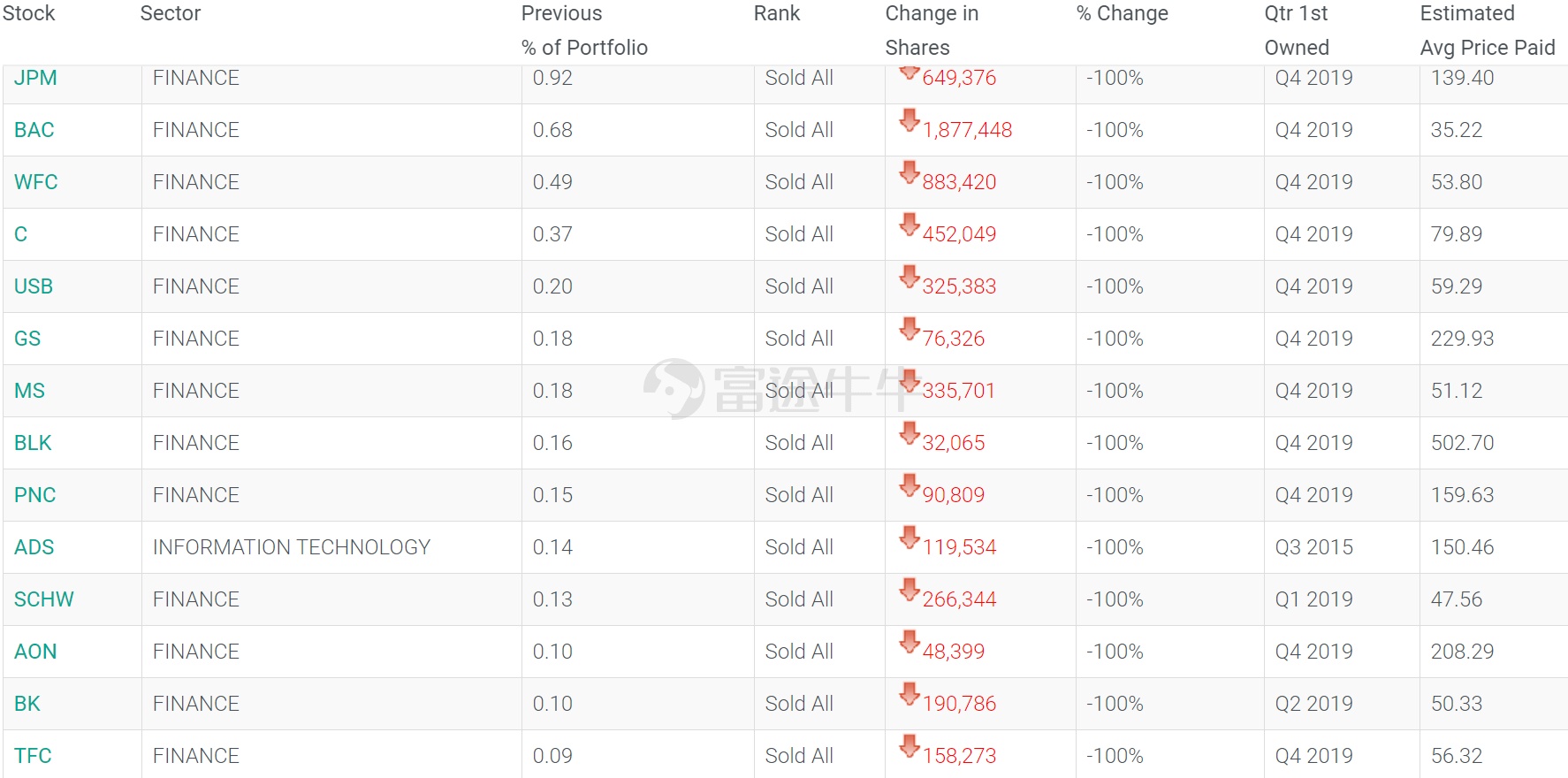 同时,包括花旗(C.US)、美国银行(BAC.US)、摩根士丹利(MS.US)以及高盛(GS.US)等金融股在这一季度几乎遭到清仓。