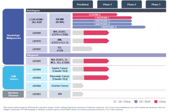 除了LCAR-B38M / JNJ-4528外,公司还有针对各种癌症的早期自体候选药物,涉及多种癌症,包括非霍奇金淋巴瘤,急性髓细胞性白血病,以及T细胞淋巴瘤等。其中前两个目前在中国由研究人员启动的1期临床试验中。公司还在开发靶向CD20 的同种异体CAR-T产品候选物,用于治疗非霍奇金淋巴瘤,目前该药物正在中国由研究人员启动的1期临床试验中。此外,公司在早期临床前和临床开发中有多种候选产品,可用于治疗实体瘤和传染病。