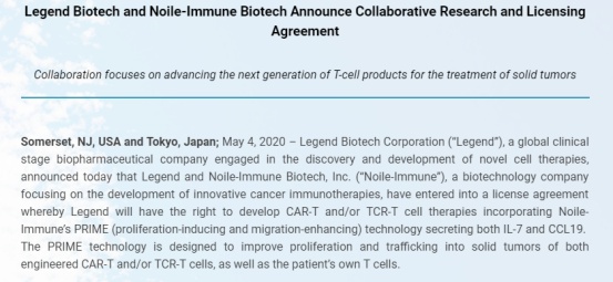 丰富的在研管线和与杨森多年合作将传奇生物的思路进一步打开,其合作伙伴覆盖面也在进一步拓展——早前,传奇生物宣布与日本创新癌症免疫疗法生物公司Noile-Immune Biotech达成合作协议。传奇生物和Noile-Immune将共同致力于两个特定的癌症靶点,传奇生物将有权将Noile-Immune 的核心PRIME(增殖诱导和增强迁移)技术应用于其细胞研发管线,开发可分泌IL-7和CCL19的CAR-T和TCR-T细胞疗法。