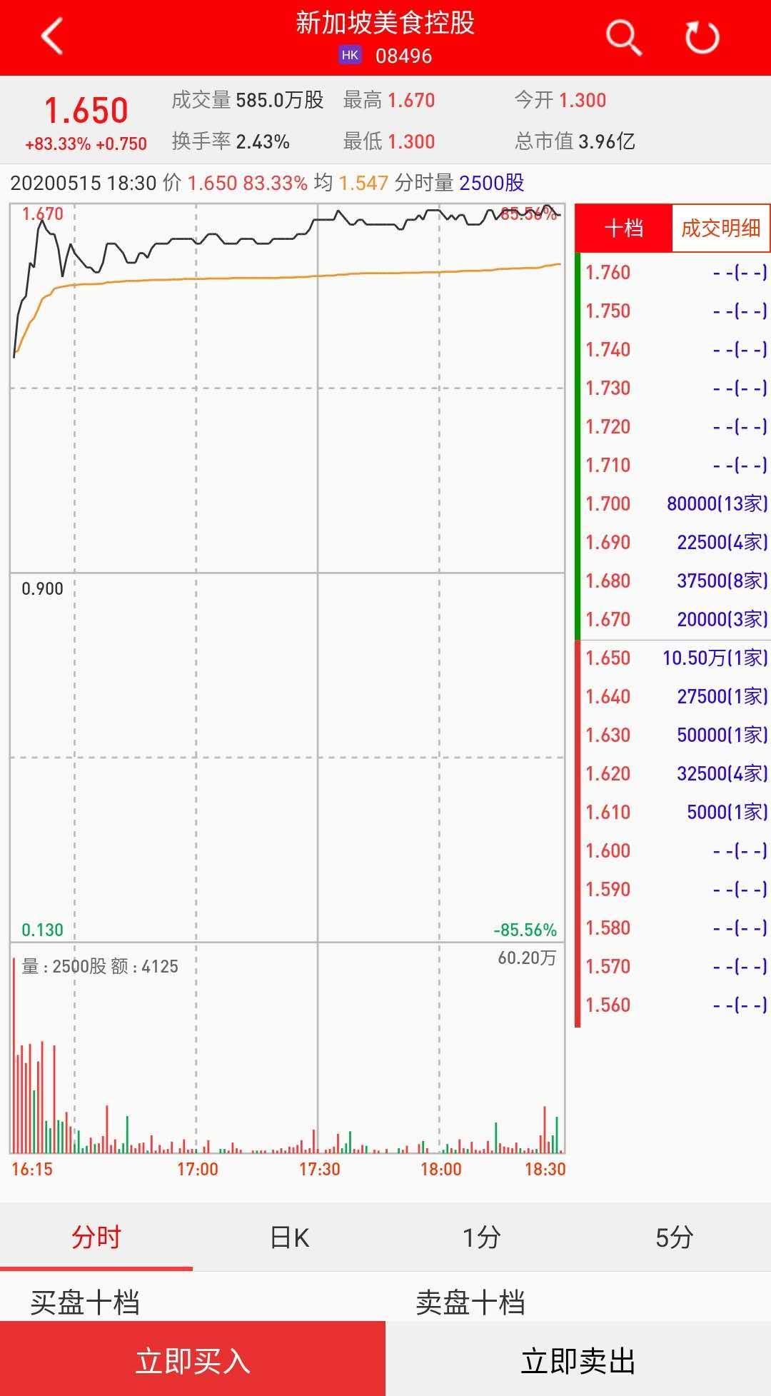 智通财经APP获悉,新加坡美食控股(08496)将于5月18日挂牌,利弗莫尔证券资料显示,截至暗盘收盘,报价为1.65港元,较招股价0.9港元上涨83.33%。每手2500股,不计手续费,每手赚1875港元。