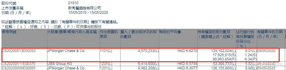 智通财经APP获悉,联交所最新资料显示,5月8日,摩根大通增持新秀丽(01910)457.52万股,每股作价6.627港元,总金额约为3031.99万港元。增持后最新持股数目为1.29亿股,最新持股比例为9.01%。