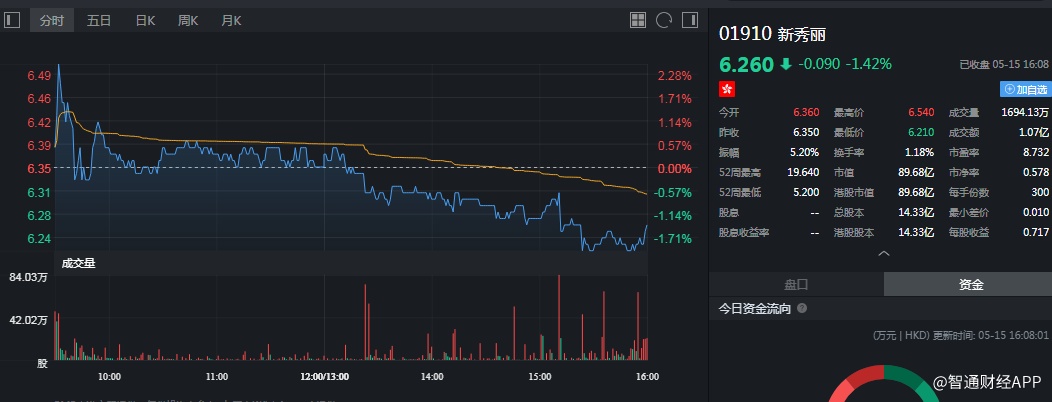 截至今日收盘,新秀丽跌1.42%,报6.26港元。
