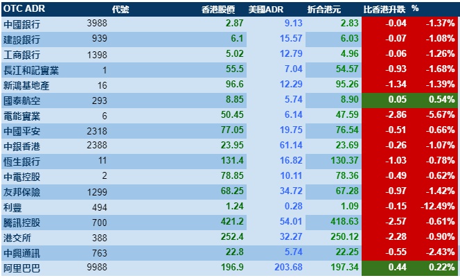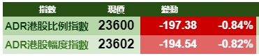 智通财经APP获悉,隔夜美股低开后震荡上行,但港股ADR指数全日受压,按比例计算,收报23600点,跌197.38点或0.84%。