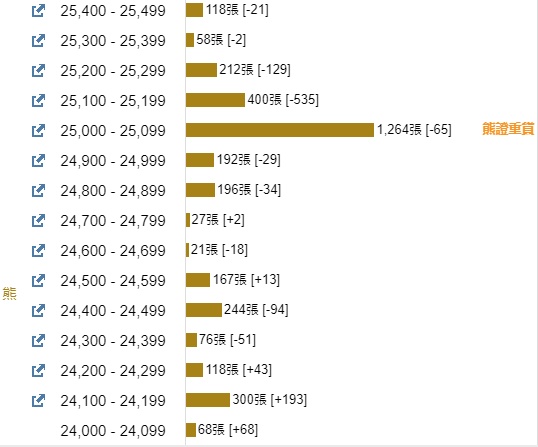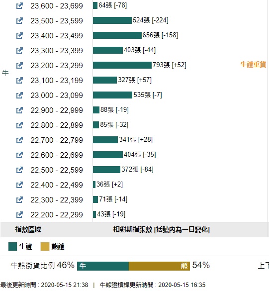 智通财经APP获悉,截至5月15日,恒指最新的牛熊街货比例46:54。摩根恒指牛熊证街货分布图中的数据显示,熊证街货重货区在25000-25099区间,该区间最新熊证数量为1264张,较上一交易日减少65张,最多新增区间在24100-24199区间,该区间最新熊证数量为300张,较上一交易日增加193张。牛证街货重货区在23200-23299区间,该区间最新牛证数量为793张,较上一交易日增加52张,最多新增在23100-23199区间,该区间最新牛证数量为327张,较上一交易日增加57张。
