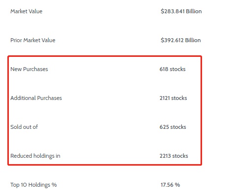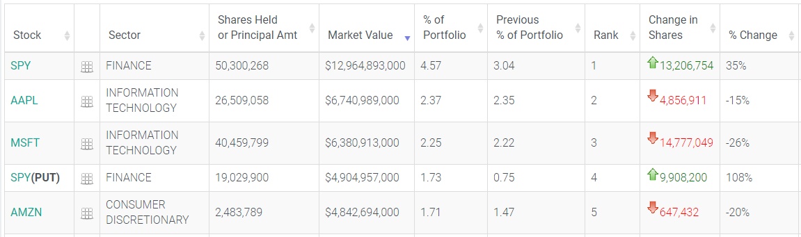 其前三大重仓股与上季度保持一致,标普500ETF(SPY.US)占比4.57%排名第一,持股市值约为130亿美元。苹果(AAPL.US)、微软(MSFT.US)分别位列第二、三位,持股市值分别位67亿和64亿美元。