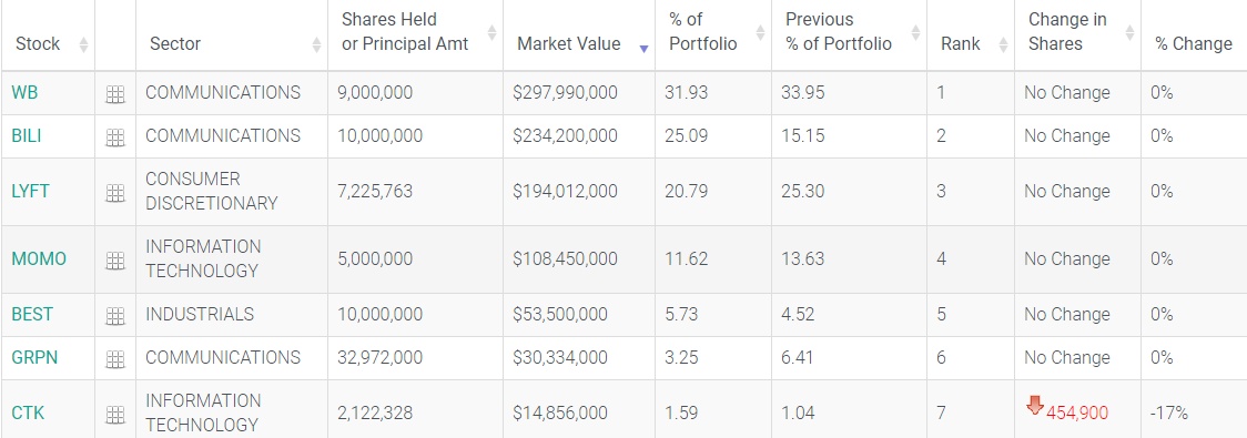 本季度,阿里巴巴唯一减持了触宝科技(CTK.US),目前该股占比1.59%,持仓约212万股,价值约1486万美元。