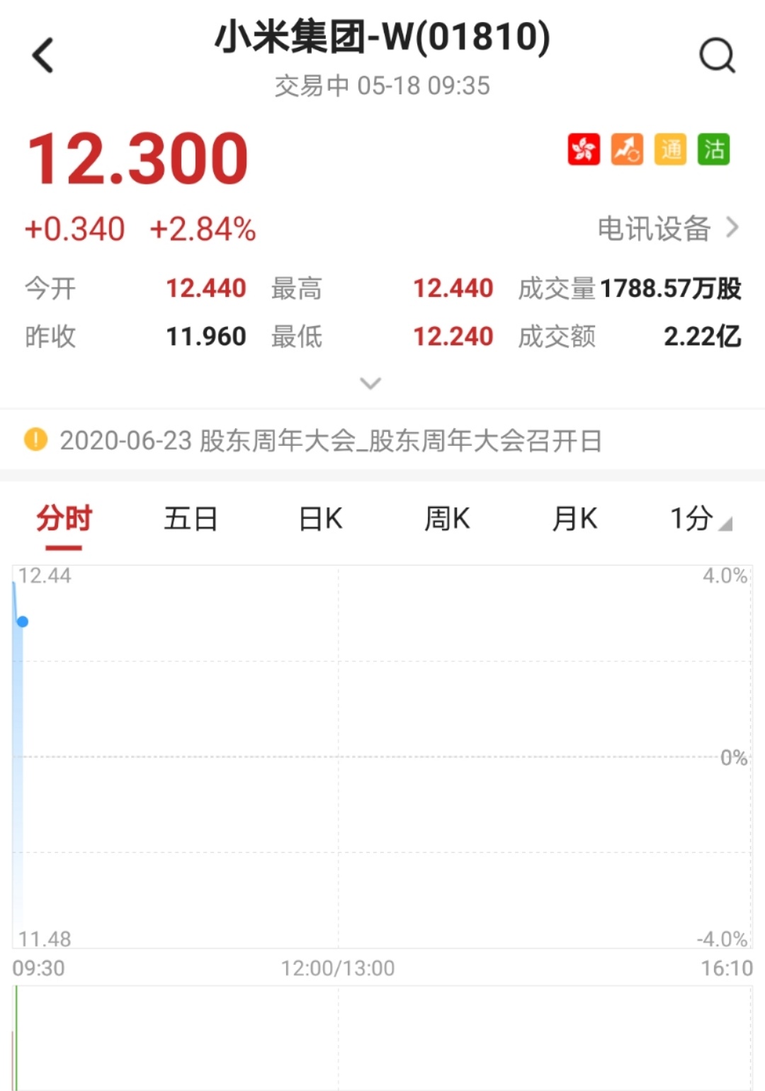 智通财经APP获悉,东吴证券发布研报称,小米集团-W(01810)具有独特的业务模式和非常高效的流通体系,从而建立了难以超越的竞争优势,该行首次覆盖给予“买入”评级,目标价16.45港元。该股早盘涨超4%,突破所有均线,创一个月新高。截至9时35分,涨2.84%,报价12.3港元,成交额2.22亿。